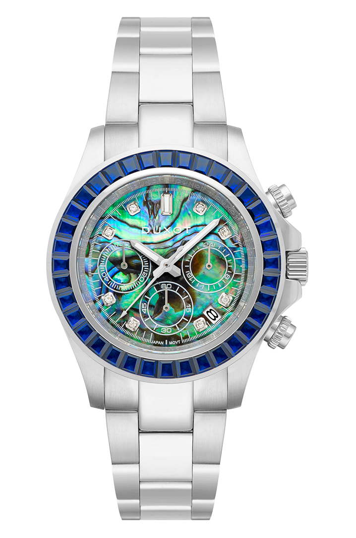 The epitome of luxury. A bezel inset with handset trapezium cut highest grade cubic zirconiums dress out a precise chronograph movement for a watch that is absolute show stopper of a timepiece. A watch for generations, a watch with style, performance, flair and built to the highest standards of watchmaking. Each watch is one of a limited edition series, uniquely numbered - never to be manufactured again, thus elevating even further this rare, magical timepiece reserved for the very few.