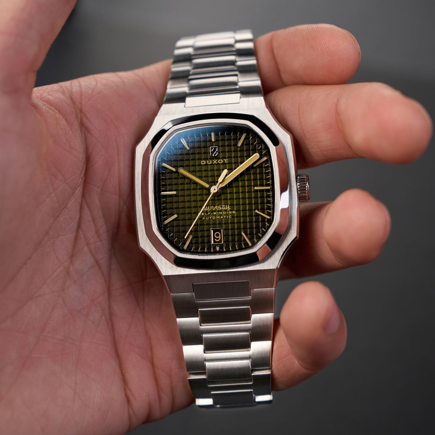 The Colmar Automatic combines an elongated octagonal case with an integrated steel bracelet, delivering bold refinement and enduring style.